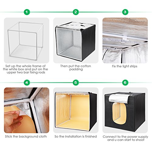 - ▶【LED ÉCLAIRAGE 4000LM 5500K】 Amzdeal studio photo est équipé de 2 LED bandes lumineuses, chaque a 50 perles LED qui fournissent la lumière puissante de 4000LM. La température de couleur est 5500K, proche de la lumière de jour, idéal pour photographie. Base fond argenté antireflet, ne laisser pas d'ombres et de réflexions inutiles sur l'objet ou l'arrière-plan, peut fournir l'effet d'éclairage parfait.