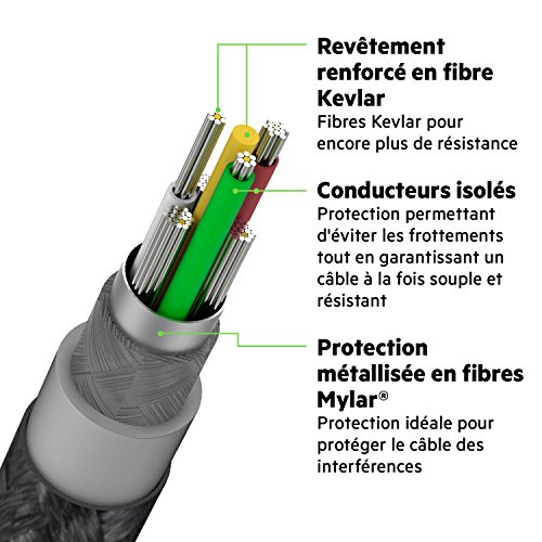 Contrairement à d'autres câbles de recharge, le câble Lightning Belkin DuraTek™ est fabriqué à partir de matériaux de qualité supérieure afin d'offrir une durabilité exceptionnelle. Les fibres Kevlar® renforcent le câblage interne, la gaine extérieure en nylon résiste à l'abrasion et l'isolation du revêtement reste très souple pour limiter les effets de frottements. L'efficacité de ces matériaux est encore améliorée par une conception soignée et intelligente, qui renforce le câble aux endroits les plus sollicités. Le produit fini peut ainsi résister à une utilisation très intensive tout en délivrant des performances supérieures. Ce câble est quasiment indestructible.Câble conçu à partir de fibres Dupont KevlarL'un des constituants essentiels qui garantit la solidité de DuraTek™ est le Kevlar®. Cette fibre extrêmement résistante est utilisée dans le monde entier dans de très nombreuses applications, des gilets pare-balles et casques de motos aux planches de surf et équipements pour sports extrêmes. Des brins solides Kevlar® ont été ajoutés à la structure du câble pour le rendre encore plus solide. Pouvant se plier sans s'étirer, ces fibres entourent et protègent les conducteurs.Revêtement en nylon tresséL'enveloppe externe du câble est en nylon haut de gamme particulièrement résistant. Le double tressage est couramment utilisé dans la fabrication des cordes. Cette technique permet d'offrir une résistance maximale tout en améliorant la résilience du câble.Isolation soupleLe câble est composé de nombreux fils électriques rassemblés pour fournir la meilleure fonctionnalité et conductivité possibles. L'isolation protège ces fils des dommages qu'ils pourraient subir lorsque le câble est plié ou étiré, mais elle peut aussi provoquer une certaine rigidité, ce qui peut affecter la souplesse générale du câble. L'isolation extrêmement souple du DuraTek™ permet de limiter les effets d...
