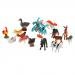 Comprend une oie, un canard, un coq, une poule, un chat, un chien, un cochon, une vache, un lapin, un âne, une chèvre, un mouton, une antilope oryx, un cerf et un arbre