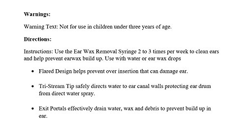 Unlike traditional bulb ear syringes that can damage the ear if inserted too far, the unique Aculife Ear Wax Removal Syringe features a flared tip design to prevent over insertion while effectively cleaning the ears and preventing ear wax buildup. The unique tip directs fluid to the ear canal walls using a tri-stream directional jet ensuring an even safer and more effective alternative to direct flow syringes. The ear wax removal syringe is used to effectively dislodge stubborn ear wax and other debris. Exit portals allow for drainage ensuring no pressure build-up occurs and any wax or debris is effectively drained safely away. For ear wax blockages it is advisable to soften the wax prior to syringing with olive oil. This unique product is designed for home use and comes complete with full user instructions. Not to be used with children under 3 years of age.