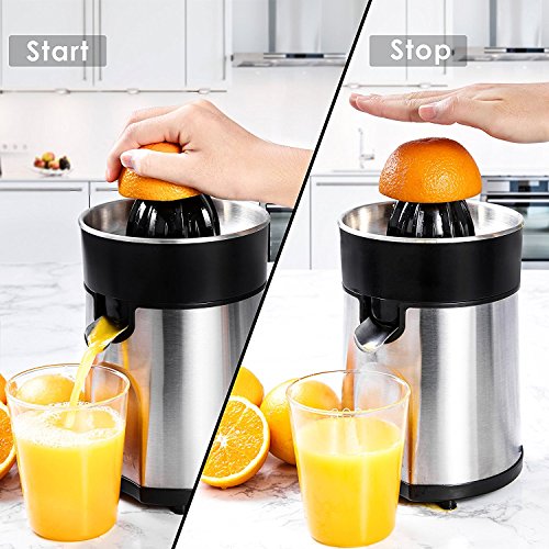 - ✔ automatico- presse-agrumes électrique marche/arrêt grâce à l'allumage et l'extinction automatique il suffit d'une simple pression sur le cône pour mettre en fonction le produit. Le double sens de rotation du cône fournit une plus grande quantité de jus avec la même quantité d'agrumes.
