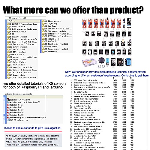 - Kit de capteur de haute qualité avec tutoriels gratuits pour Arduino et raspberry pi. Bonne rétroaction de nos clients, alors choisissez-nous, vous obtiendrez un kit de haute qualité et fiable