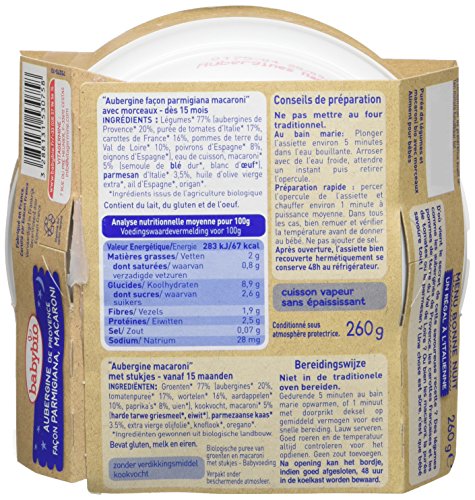 Babybio Assiette Aubergines de Provence Façon Parmigiana/Macaroni 15+ Mois 260 g - Lot de 4