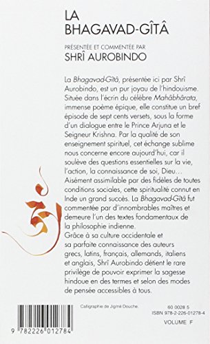 Poème mystique de 700 versets, inséré dans la grande épopée anonyme du Mahabharata, La Bhagavad-Gîtâ, "le chant du Seigneur", est considérée comme la "Bible de l'Inde". Le dieu Krishna, avatar de Vishnu (voir Mythes et dieux de l'Inde), prenant la forme d'un conducteur de char, expose ici, au jeune guerrier Arjuna, une doctrine portant sur l'action, la discrimination, la connaissance et la dévotion. La présente traduction est de Camille Rao et, Jean Herbert, indianiste bien connu, qui est aussi le préfacier. Le volume comprend un glossaire, un index et des "définitions psychologiques" importantes. Parmi les innombrables commentaires écrits sur ce texte, celui de Shri Aurobindo (1872-1950) offre l'intérêt du regard d'un homme qui se retira de la vie publique après une carrière politique ardente pour rechercher une religion synthétique universelle. Fondateur, en 1926, d'un ashram dont il fut le gourou très influent jusqu'à sa mort, il a su adapter la pensée indienne à la vie moderne. Formé en Occident, il rend ici accessible pour nous ce grand trésor spirituel. --Colette-Rebecca Estin