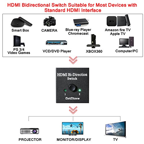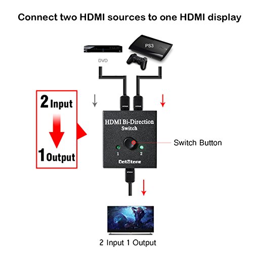 - ➤ 2 x 1 / 1 x 2 HDMI Commutateur Boîte: Commutateur Bidirectionnel soutien HDMI Plug et jouer. HDMI- commutateur connecte 2 HDMI sources à 1 HDMI écran ou connecte 1 HDMI source pour basculer entre 2 affichages(Remarque:2 affichages ne peuvent pas afficher en le même temps)