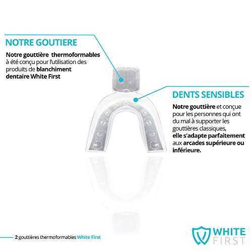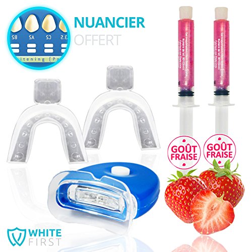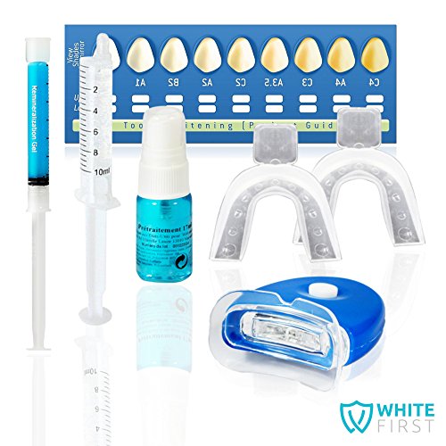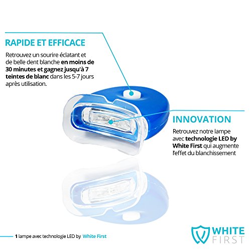 - NOTRE KIT BLANCHIMENT DENTAIRE : Retrouvez notre lampe avec technologie LED by White First qui augmente l'effet du blanchissement . Vous recevrez aussi 2 gouttiere dentaire , 20ml de gel blanchiment , 1 plaquette de teinte et une trousse de rangement transparente.