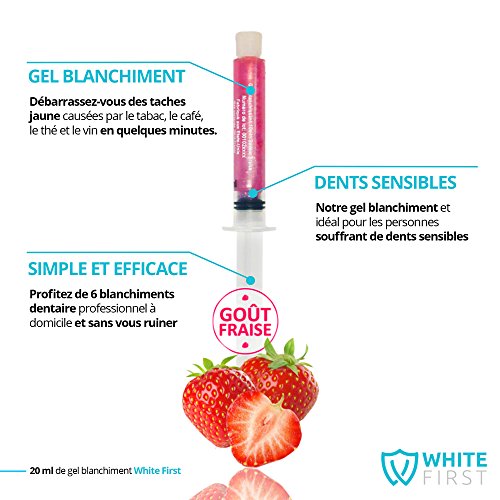 Kit blanchiment dentaire White First - Kit blanchissement dentaire avec 20ml de gel blanchiment parfum fraise. Les produits dentaire dans nos kits blanchiment des dents sont idéal pour les personnes souffrant de dents sensibles.
