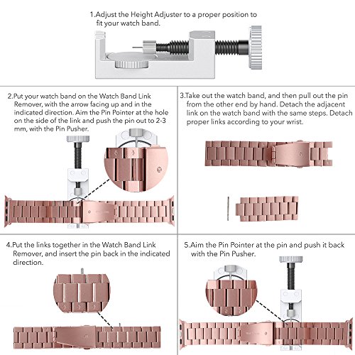 Simpeak Bracelet Apple Watch 42mm Métal Fermoir en Acier Inoxydable Bande de Remplacement pour Apple Watch Series 3 Series 2 Series 1 - Noir Remarque: 1. Le produit n'est que la montre, la montre Apple n'est pas incluse. 2. Pour redimensionner la bande, reportez-vous à l'Instruction dans le colis ou à la dernière image dans la liste. Cela devrait être fait par des compétences techniques avec une force modérée, si vous n'avez pas déjà fait ce travail, nous vous suggérons de l'amener à un bijoutier pour qu'il soit dimensionné. 3. Assurez-vous que le connecteur n'est pas installé en arrière, ou la connexion n'est pas suffisamment ferme et facile à tomber. Coloré: Il existe quatre couleurs dont argent, noir, or rosé, or champagne. Peu importe que vous soyez un homme d'affaires ou un pionnier, ce groupe de montre affichera votre style. Durable: La bande est composée de 52 pièces de boules en acier, donc elle est durable et robuste. Simple: Chaque section de la bande est composée de 3 pièces d'acier, rendant tout le groupe simple mais généreux. La surface mate de l'acier est polie par une technique de tirage au fil montrant la qualité instinctive de l'acier. Caractéristiques: Longueur: 180mm Largeur: 24mm Poids: 98g Paquet: 1x Bracelet Apple Watch 38mm avec 2 adaptateurs 1x Vis 1x outil de suppression des liens