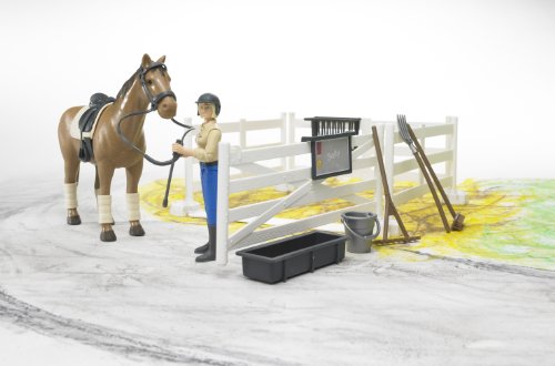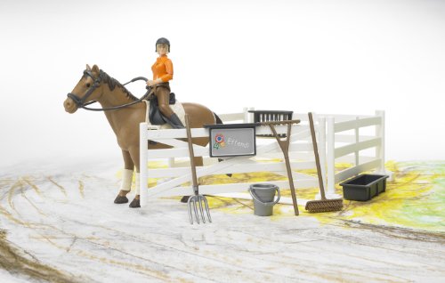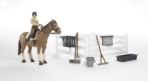 Contient : 1 cavalière (env. 10 cm de haut)1 cheval1 râteau1 fourche1 balais4 guêtrons1 selle1 bombe de cavalier1 bride1 seau1 environnement de jeu complet avec cheval, portes et nombreux accessoires.Les sports équestres provoque souvent un réel attrait envers les enfant, surtout envers les filles.