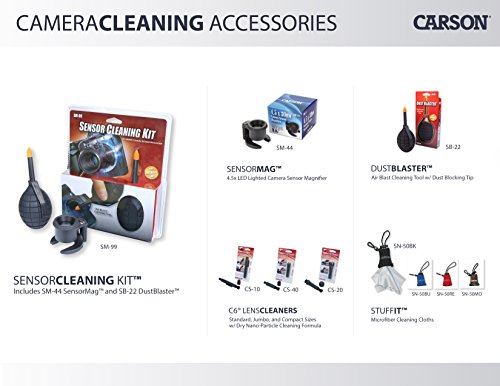 The SensorMag will help you clean any dust and debris on your camera sensor helping you to eliminate the need to digitally correct pictures. The 4.5x power SensorMag rests comfortably inside the camera lens hole and has an adjustable focus for different size cameras and sensor depths. This hands-free loupe allows you to magnify and aids you in cleaning the sensor. There are two different diameter settings to fit most camera bodies.The 6 bright white LEDâ€TMs in the base of the SensorMag light your way to a clean sensor. The SensorMag is unique in the fact that the lens can rotate 45 degrees out of the way which helps you to gain better access to the sensor while still being able to use the LED lights. It leaves room for a small tool or cleaning brush to be used while looking through the lens of the sensor. It is small enough to carry in your camera bag and comes included with a zippered pouch and 2 CR2032 button cell batteries. At Carson, we strive to make sure our customers are 100% satisfied with the quality of our magnifiers. We are so confident in our magnifiers that we back them with a Lifetime Limited Warranty! Carson will repair or replace your magnifier if it is found to have manufacturing defects in materials or workmanship. Please contact Carson for additional warranty details.