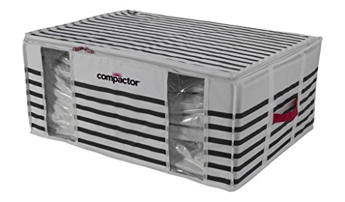 Box de rangement COMPACTOR Mariniere - Matériau : Polyéthylene - Revetement : polypropylene - Coloris : Blanc et bleu - Forme : rectangulaire - Dimensions : 65x50x27cm - L'indispensable housse Compactor Mariniere spéciale vetements permet de ranger vetements et linges encombrants en gagnant 75 % d'espace grâce au systeme innovant de vide d'air.