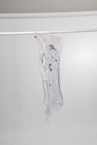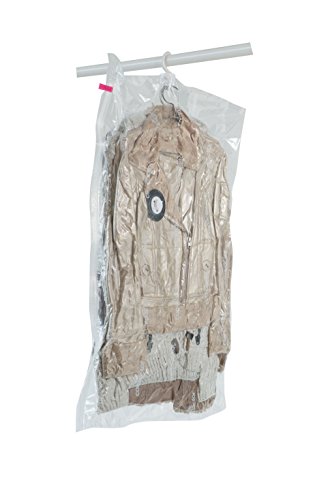 Housse courte sous vide d'air a suspendre en nylon et polyéthylene de coloris transparent. Taille : S. Capacité : 50 L. Fermeture zippée, avec curseur fourni. Cintre intégré. Contenance : 5 vestes. Permettre de compresser les vetements inutilisés dans la penderie, a l'aide d'un aspirateur. Dimensions : 70x105 cm.