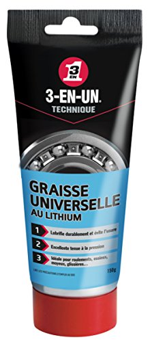 - Lubrification de longue durée de tous les mécanismes qui roulent, tournent, glissent et s'emboîtent. Tenue à la pression et à l'usure, résistante à l'eau, elle réduit les coefficients de frottement tout en protégeant de la rouille et la corrosion. Plage de température -20° à +140°C. - Contenance: Tube 150 g Marque: 3 en 1