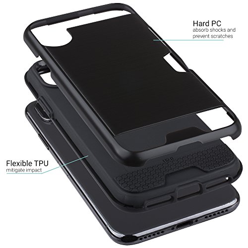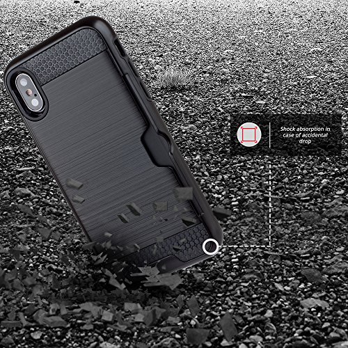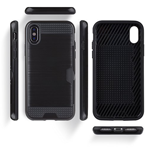 La coque iPhone X est faite avec excellence et peut offrir à la fois une protection robuste et un aspect luxueux. Il a 2 couches détachables - TPU flexible et polycarbonate dur résistant aux chocs. La fente pour le stockage de la carte pratique offre une place pour 1 carte essentielle, qui est positionnée en sécurité entre les deux couches. La technologie d'absorption des chocs et le motif métallique brossé finement fini sont en parfait équilibre, la coque offre une protection, une commodité, une élégance et une coupe ajustée pour votre téléphone. La photo du produit n'est destiné qu'à l'information. La vraie forme et les découpes tiennent parfaitement au modèle de téléphone mentionné dans cette offre. Le téléphone est NON incluse.