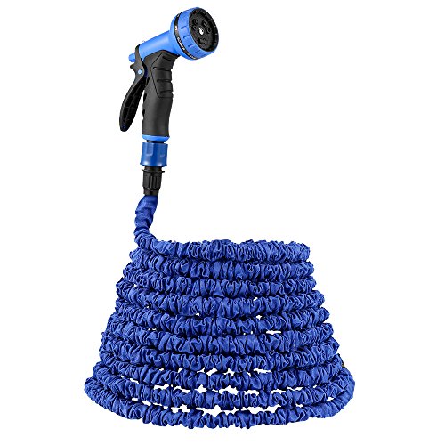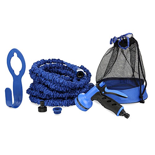 PLEMO Kit de Tuyau d'Arrosage Bleu Extensible Rétractable 7.5 à 22 mètres, Pistolet d'Arrosage 9 Fonction, Connecteur Robinet 1.9cm (3/4 in) de diamètre et 1.27cm (1/2 in)