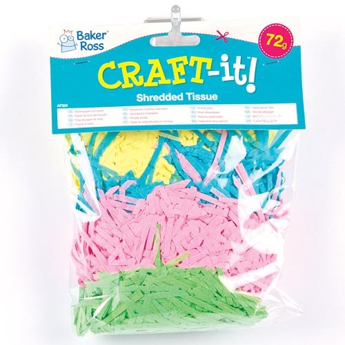 Shredded tissue in 4 assorted Spring colours.;Perfect for Easter crafts - use to fill Easter baskets then add chocolate eggs.;Also makes a great addition to Easter bonnets or pictures.;72g per pack.