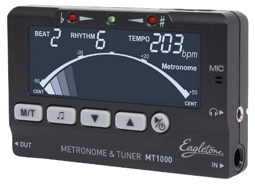 Le MT1000 est l'accordeur-métronome le plus complet jamais proposé à ce jour dans la gamme Eagletone. Il regroupe 3 outils indispensables à la pratique instrumentale (accordeur, métronome et diapason), dont la qualité répond au plus exigeant des utilisateurs. Caractéristiques techniques :Accordeur - Plage d'accord : de La 0 (27,5 Hz) à Do 8 (4186 Hz)- Modes disponibles : Chromatique, Guitare en Mi, Mib ou Ré, Basse en Mi, Mib ou Ré, Violon, Ukulele, Instruments à vent en Fa, Sib et Mib- L'écran s'illumine en vert quand la note exacte est atteinte- 3 diodes-témoin indiquent la justesse d'accord- Accordage des instruments acoustiques par micro intégré ou capteur de vibrations inclus- Le capteur est une pince à placer sur la tête d'une guitare ou le pavillon d'un instrument à vent, afin d'accorder grâce aux vibrations transmises par l'instrument, sans perturbation possible par les bruits extérieurs- Entrée et sortie jack 6,35 mm permettant l'insertion dans une chaine de pédales d'effets, afin de s'accorder à tout moment sans se débrancherMétronome - Plage de tempo : de 30 à 250 battements par minute - Réglage du tempo au battement près- 8 figures rythmiques (croches, croches pointées, triolets, etc...).- 9 accentuations de battement- Visualisation des battements du métronome à l'écran, aussi didactique qu'un modèle mécanique- Sonorité nette et agréable ne générant pas de fatigue auditive- Haut-parleur intégré à volume réglable- Sortie casque au format mini-jack 3,5 mm (le branchement d'un casque coupe le haut-parleur et passe en mode silencieux) Diapason- La 4 réglable de 430 à 450 Hz- Autres notes du diapason disponibles : La 2 à La 6- Peut aussi être utilisé en guide-chantGénéral- Support d'inclinaison escamotable offrant une orientation idéale de l'écran- Extinction automatique après 5 minutes sans utilisation- Changement des piles simple et rapide- Dimensions : 99 x 62 x 19 mm- Poids : 92 g (avec piles)-...