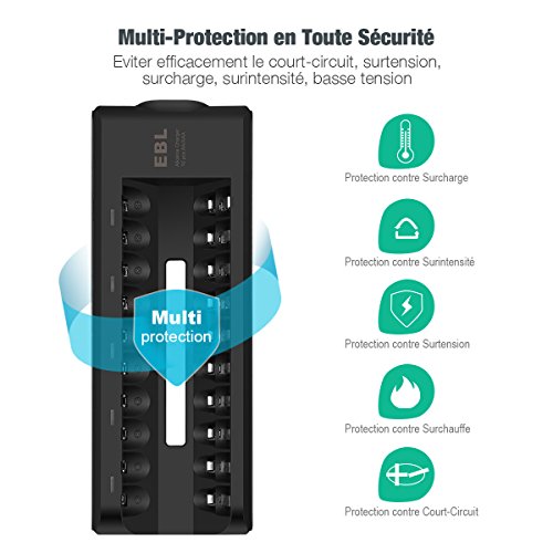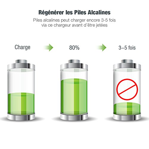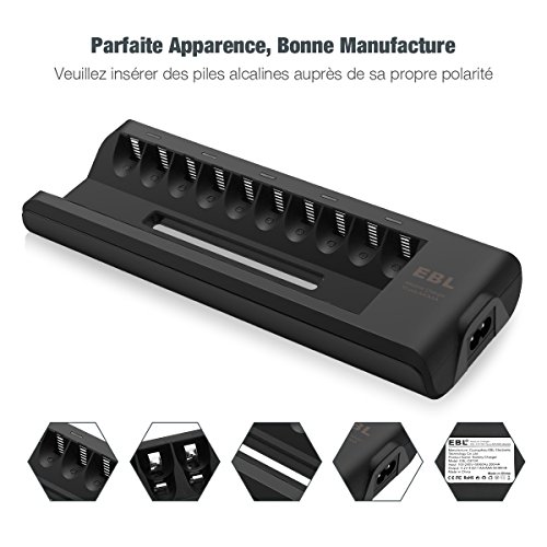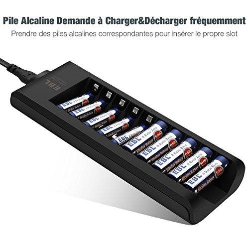 - 【Chargeur de Piles Alcalines】: EBL a bien désigné et fabriqué ce nouveau chargeur de piles alcalines, en adoptant des matériaux de superbe qualité et la technique avancée pour charger plus rapidement en toute sécurité, hors cela il peut charger les piles jetables de 3 à 5 fois.