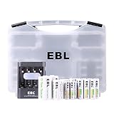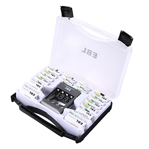 EBL Chargeur de Piles Rechargeable Rapide + 8 Piles AA + 4 Piles AAA + 2 Boîte de rangement(Noir) + Adaptateur Piles C D pour Piles AA