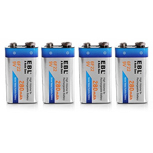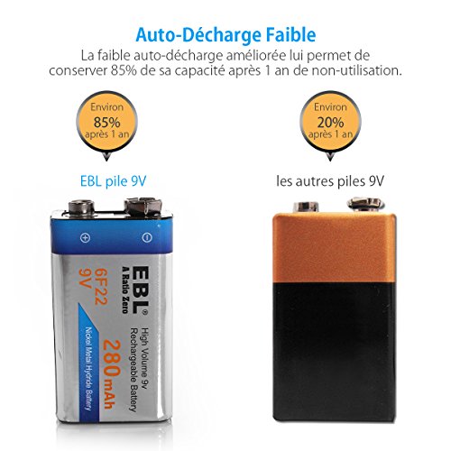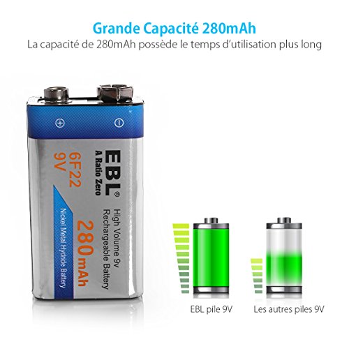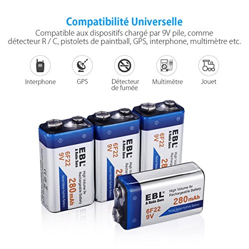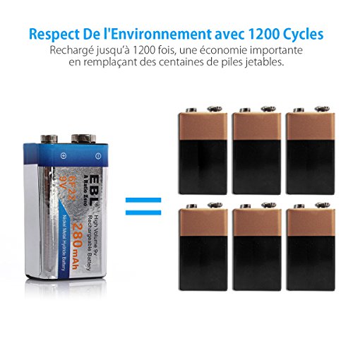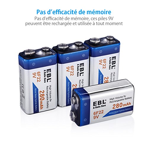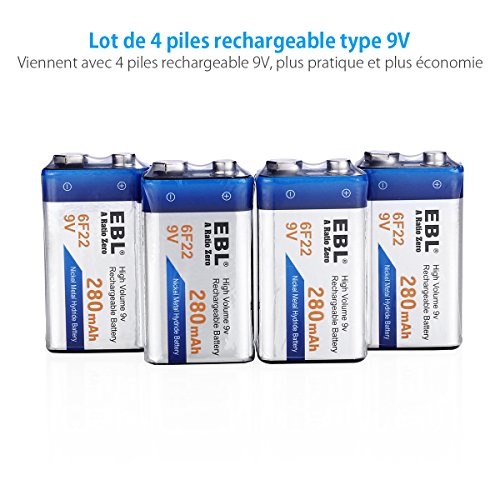 EBL lot de 4 piles rechargeables type 9V 280mAh 9V batterie avec 1200cycles