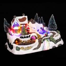 - Village lumineux et animé de noël. Scène de Noël: maison sous la neige avec le pere noel qui arrive dans le ciel en traineau (animé) et le train qui tourne (animé). De plus, les leds illuminent la scène!