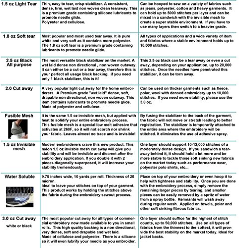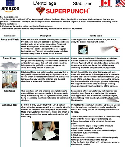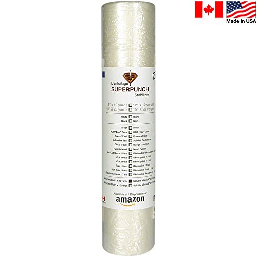4ième meilleur vendeur de superpunch dans Amazon États-Unis et Canada. Utilisé sur le dessus d'un tissu épais pour maintenir enfoncée les fibres. Très populaire sur les serviettes, polaire, chandails et autres tricots souples, il empêche les points de se perdre dans la fibre. Une fois la broderie terminée, le film aquatique est retiré en utilisant une bouteille pulvérisateur d'eau.