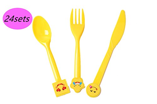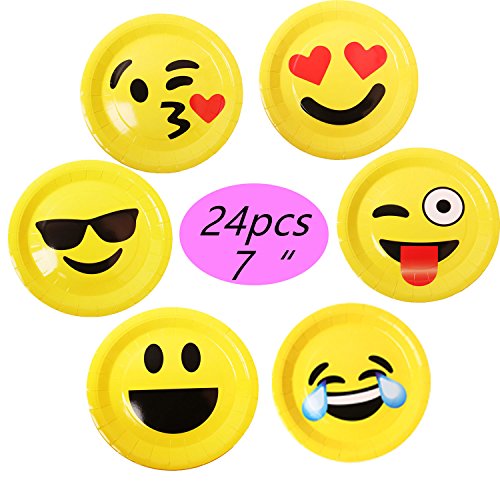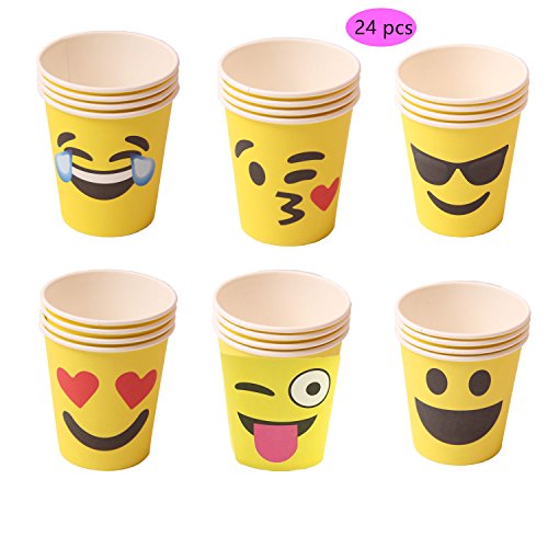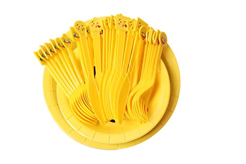 - 24 assiettes en papier de 17,7 cm + 24 assiettes en papier émoji de 22,9 cm + 24 gobelets en papier de 255 g + 24 ensembles cuillères, fourchettes, couteaux émoji + 20 serviettes.