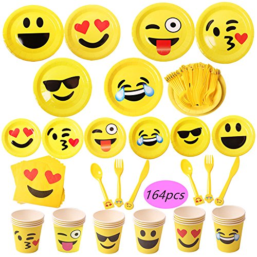 Foci cozi Ensemble de fête motif émoji, 164 articles, assiettes en papier 17,8 cm et 22,9 cm, serviettes et tasses en papier, ustensiles émoji pour 24 personnes