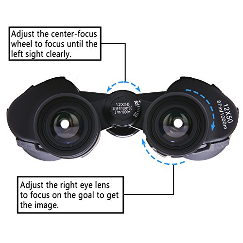 - ???? Jumelles de 4.12 x 50, avec un grossissement de 12x cette binoculaire peut amener le sujet 12 fois plus près, diamètre de l'objectif de 50mm, elle laisse passer plus de lumière, et elle est très claire pour les détails même si elle est à faible luminosité