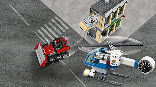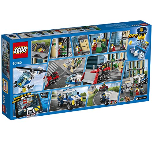 La police de LEGO City entre en action et protège le coffre de la banque et le distributeur contre les bandits et leur bulldozer, avec une équipe de sécurité pleine d'accessoires, un hélicoptère avec des projecteurs, des rotors qui tournent, plus le bulldozer des bandits avec des chaines et des crochets. Inclut cinq figurines, plus une figurine de chien policier.. . - Inclut cinq figurines : un policier, un pilote, une spécialiste de la police et deux bandits, plus une figurine de chien policier.. - Comprend un bâtiment de banque, un hélicoptère, un camion et un bulldozer.. - La banque comprend deux niveaux avec un coffre-fort et un distributeur de billets qui peuvent tous les deux être arrachés du mur, une salle d'attente au premier étage et une porte de sécurité à barreaux qui s'ouvre au deuxième étage, un tuyau d'évacuation sur le côté du bâtiment pour monter, une entrée sur le toit par une trappe, une porte d'entrée qui s'ouvre et un bureau de caissier. ...