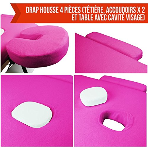 - Nombre de pièces : 4 (Table, têtière et accoudoirs x 2) / Bords : Élastique (pour une meilleure tenue) / Cavité visage : Avec