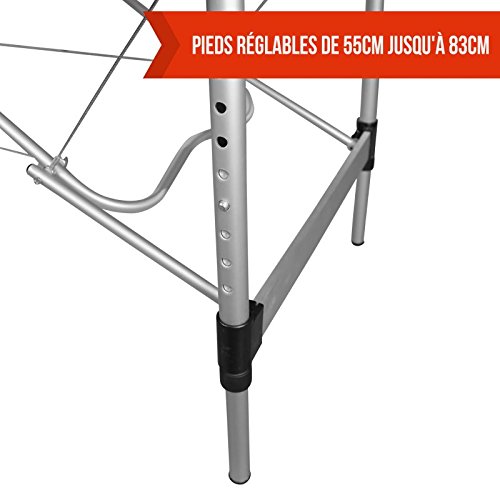 - Poids de la table avec sac de transport et accessoires : 13.350 Kg - Poids de la table seule : 11.100 Kg - Dimensions de la table repliée : 92 x 69 x 17 cm - Table réglable en hauteur : 55 à 83 cm - Surface allongée sans appuie-tête et accoudoirs : 185 x 70 cm - Surface allongée avec appuie-tête et accoudoirs : 215 x 90 cm