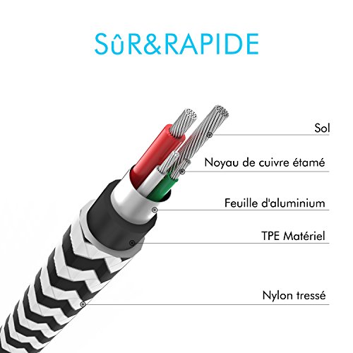 - 3.Gaine en Nylon Tressé : Câble audio auxiliaire 3.5mm extrêmement solide et ultra résistant,empêche l'enchevêtrement,sans ne vous inquiétez pas du nouage.