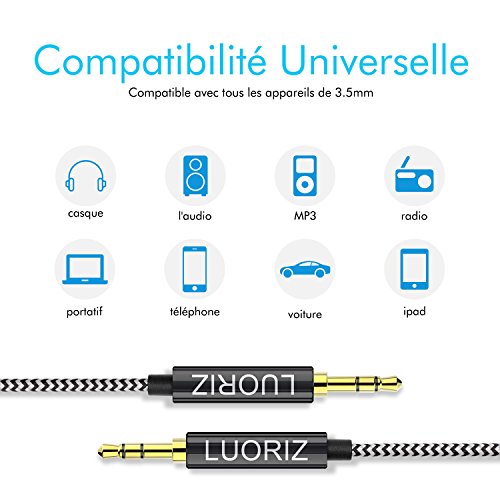 - 1.Compatibilité : Câble audio parfaitement Compatible avec un casque audio,iPod,iPhone,iPad,tablette,ordinateur portable,autoradios,lecteur MP3 smartphones Nokia LG Huawei et bien d'autres appareils audio avec auxiliaire de 3.5 mm.