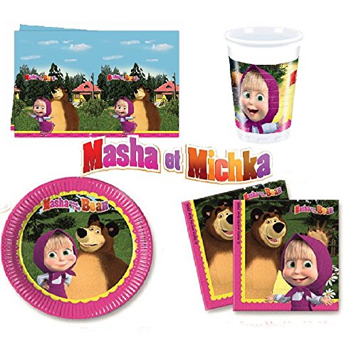 Kit complet Masha et l'ours Michka décoration fête anniversaire pour 8 enfants (Assiettes, serviettes, gobelets et nappe)