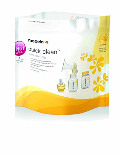 Medela Quick Clean 5 Sachets pour Micro-Ondes est un article pratique vous permettant de désinfecter et de stériliser les accessoires d'allaitement (biberons, téterelles) en moins de trois minutes et en seulement trois étapes. Cette désinfection à la vapeur rend la stérilisation plus rapide et plus facile qu'à l'eau bouillante.Pendant le processus de nettoyage, 99.9% des microbes et bactéries les plus courants sont éliminés.Petits et pratiques à ranger, les sachets Quickclean s'emportent partout et assurent la désinfection à la maison et en vacances ou en déplacement.