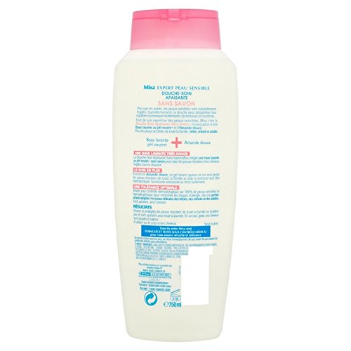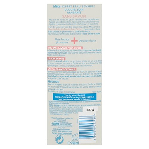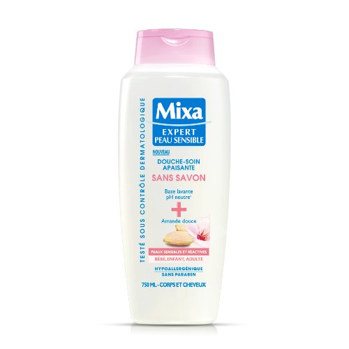MIXA Douche-Soin Apaisante Sans Savon Flacon 750ml. C'est l'association d'une base lavante au PH neutre et d'amande douce. Il apaise en un seul geste les peaux réactives de toute la famille et aide a renforcer leur film hydrolipidique. Sa mousse onctueuse se rince facilement. Vendu a l'unité.