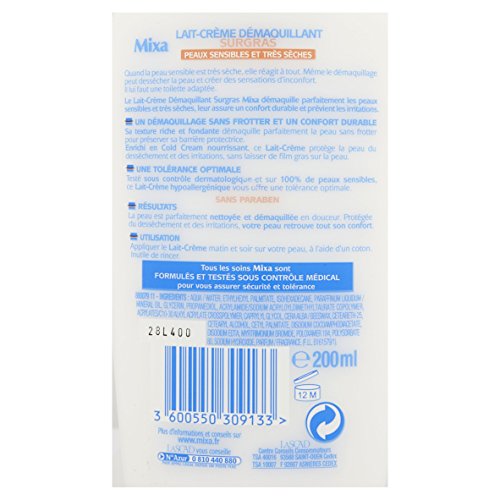 - Quand la peau sensible est très sèche, elle réagit à tout. Même le démaquillage peut dessécher la peau et créer des sensations d'inconfort. Il lui faut une toilette adaptée: le Lait-Crème démaquillant Surgras de Mixa, enrichi en cold cream, démaquilla la peau sans frotter et sans irriter et lui procure un confort durable grâce à sa texture onctueuse. HYPOALLERGENIQUE -SANS PARABEN