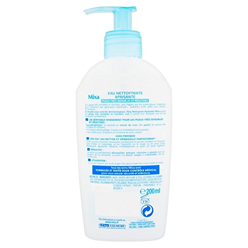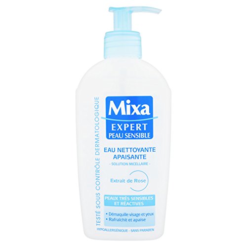 - L'Eau Nettoyante Apaisante Mixa enrichie en extrait de rose apaise les peaux très sensibles et réactives, et aide à calmer leur réactivité tout en les nettoyant parfaitement. A chaque démaquillage, la peau est immédiatement apaisée. Jour après jour, irritations et tiraillements sont calmés. Formulée sous contrôle médical. Hypoallergénique, sans parabène.