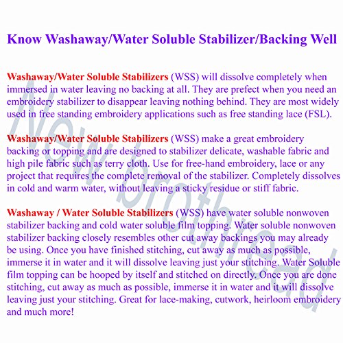 - ▶ Wash away Stabilisateur de Broderie se dissout complètement lorsqu'il est immergé dans l'eau. Un grand choix quand vous avez besoin d'un stabilisateur de broderie à disparaître.