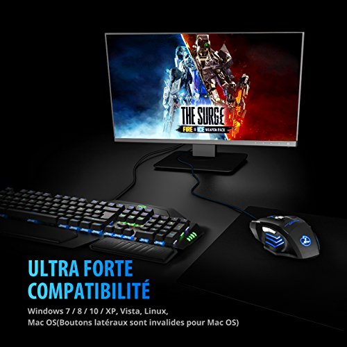 - Haussez Votre Niveau de Jeu. Obtenez une précision de suivi maximale du capteur optique réactif de notre souris gaming. Avec 5 paramètres de résolution(1000/1600/2400/3200/5500), vous permet aisément de changer, afin d'utiliser le nombre de DPI optimal pour votre performance