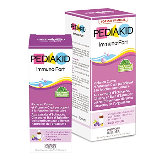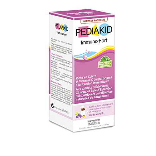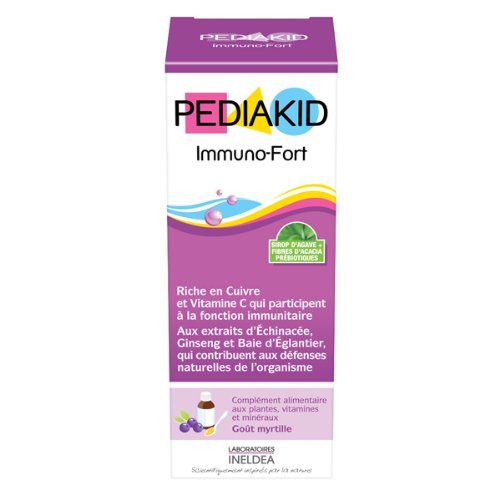 Pediakid Immuno-Fort Format Familial 250 ml goût myrtille, est un complément alimentaire sous forme de sirop qui permet de soutenir l'ensemble des défenses de l'organisme.Composé d'extraits d'Echinacée, Ginseng, baie d'Eglantier, Acérola, Cynorrhodon, Brocoli, Vitamine C, Manganèse et Cuivre, actifs naturels, ce sirop participe à la fonction immunitaire et contribue aux défenses naturelles de l'organisme.Il est idéal aux changements de saison, périodes propices aux refroidissements à répétition.