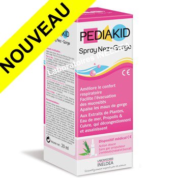 Pediakid Spray Nez - Gorge 20 ml est un dispositif médical destiné à soulager les symptômes des refroidissements (rhume, sinusite, maux de gorge, coups de froid...), spécialement conseillé aux nourrissons et jeunes enfants.Il associe :- une solution d'eau de mer à base de sel de la mer morte légèrement hypertonique,- l'eau florale d'Eucalyptus BIO, reconnue pour soulager les inflammations des voies respiratoires,- Echinacée, Propolis BIO et Cuivre reconnus pour leurs propriétés immunostimulantes, ils aident l'organisme de l'enfant à combattre les agressions extérieures (virus, bactéries),- Romarin qui renforce la formule grâce à ses propriétés décongestionnantes et antiseptiques,- Aloe Vera à l'action adoucissante, apaisante et cicatrisante qui permet de soulager immédiatement les irritations, les inflammations et la sécheresse des muqueuses du nez et de la gorge en cas de rhume.Sans gaz propulseur, ce spray permet de soulager le rhume chez l'enfant.