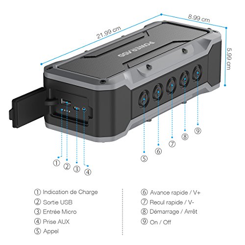 - Technologie Bluetooth 4.2: MusicFly peut être couplé facilement à des appareils compatibles Bluetooth en quelques secondes dans un rayon de 33 pieds sans fil. En outre, vous pouvez recevoir et prendre des appels téléphoniques mains libres avec un microphone intégré. Avec le bouton de contrôle de rétroéclairage dédié, vous pouvez facilement contrôler l'enceinte dans un environnement sombre.