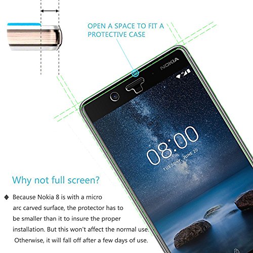 - Service rapide et bon. Garantie de remplacement à vie. Remarque: C'est parce que l'ecran de Nokia 8 est avec les bordures incurvés, donc le protecteur ne recouvre pas complètement l'écran, mais seulement la zone plate.