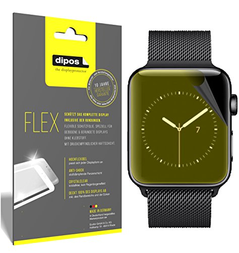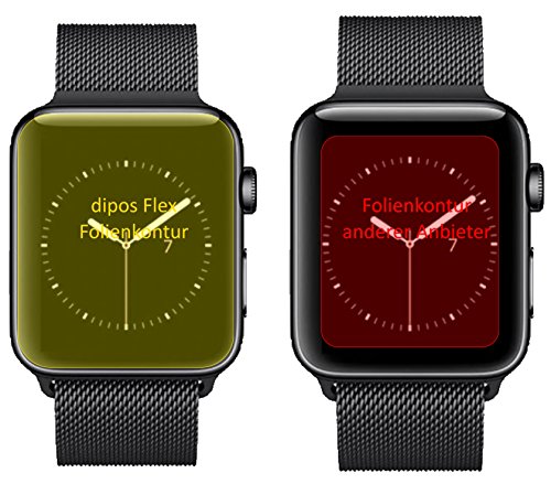 dipos FLEX a été spécialement conçu pour l'écran courbé du Apple Watch Series 3 38mm et le protège entièrement jusqu'au bord.