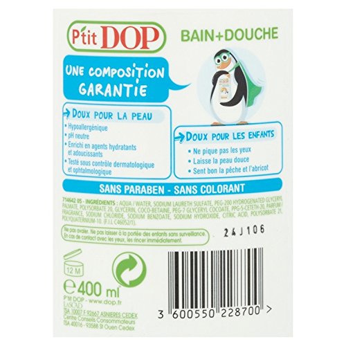 - Avec P'tit DOP Shampooing Pêche/Abricot, faites du shampooing un moment de plaisir pour votre enfant. Le parfum gourmand de la pêche et de l'abricot parfumera délicieusement les cheveux de votre enfant. Enrichi en agents hydratants et adoucissants, les cheveux de votre enfant garderont toute leur douceur. Doux pour les cheveux : hypoallergénique, pH neutre, testé sous contrôle dermatologique et ophtalmique, sans paraben, sans colorant.