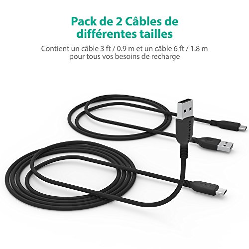 - Pack de 2 Câbles de différentes tailles: Contient un câble 3 ft / 0.9 m et un câble 6 ft / 1.8 m pour convenir à tous vos besoins de recharge; disponibles en noir ou blanc selon la couleur de votre appareil ou de votre chargeur