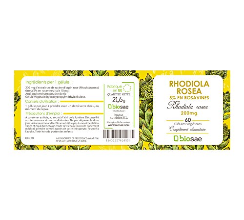 PROPRIÉTÉS DU RHODIOLA ROSEA La Rhodiola rosea (Rhodiola rosea) pousse dans les régions très froides des hautes montagnes, généralement dans les zones de l'Arctique, la Sibérie, l'Asie centrale, la Scandinavie et l'Islande. Elle est également connue sous le nom de « racine d'or » ou « racine de l'Arctique ». C'est une plante à fleurs de la famille Crassulaceae, dont les capacités médicinales et thérapeutiques sont reconnues et utilisées depuis l'antiquité.COMMENT FONCTIONNE LA RHODIOLA ROSEA? Pour un bon fonctionnement de la rhodiola rosea dans l'organisme, elle doit être titrée de 5% minimum en rosavines. La rhodiola rosea est particulièrement puissante pour augmenter la capacité de concentration, pour résoudre les problèmes liés au stress, la fatigue physique et mentale et le manque de résistance. Elle est également utilisée pour lutter contre le manque d'oxygène en altitude et est très efficace dans la régulation de la pression artérielle, la protection du cœur et toutes les maladies liées. POURQUOI CHOISIR LA RHODIOLA ROSEA DE BIOSAE? La rhodiola rosea de la marque Biosae est entièrement fabriqué en Europe, elle contient au moins 5% de rosavines, pourcentage minimum pour être considéré comme une extrait de qualité et pour avoir la capacité de restaurer la vitalité intellectuelle, le dynamisme naturel et réduire la fatigue. Sa gélule végétale est de l'hydroxypropylméthylcellulose et son anti-agglomérant de la poudre de riz. Tous les produits Biosae sont fabriqués dans un laboratoire conforme aux normes BPF (bonnes pratiques de fabrication- GMP, Good Manufacturing Practice) et certifiés ISO 22000 (gestion de la sécurité alimentaire).
