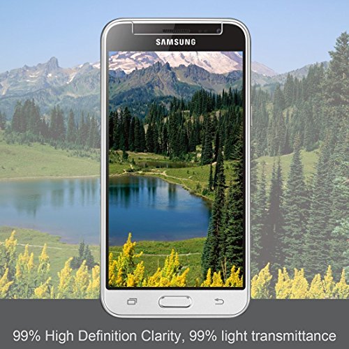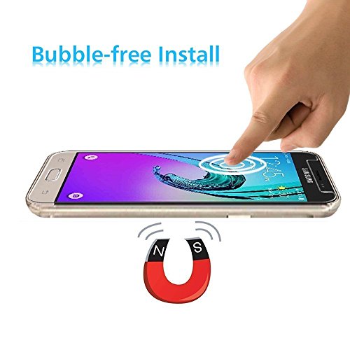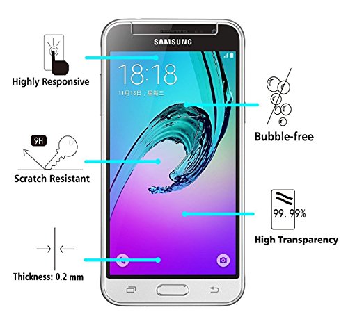 - Remarque: C'est parce que l'écran de Samsung Galaxy J3 est avec les bordures incurvés, donc le protecteur ne recouvre pas complètement l'écran, mais seulement la zone plate. Il est fabriqué en verre trempé premium de haute qualité avec l'épaisseur de 0.26 mm et des bordures arrondis, est exclusivement pourSamsung Galaxy J3.